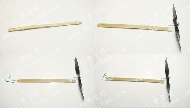 2、用熱熔膠把螺旋槳固定安裝在竹棍上,竹棍的另外一端,利用回形針做一個固定在竹棍的吊鉤。