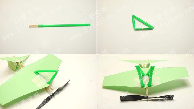 6、利用廢吸管制作飛機模型的起落架,方法是把吸管截短后折合粘貼成首位相接的三角形,然后用熱熔膠粘在螺旋槳飛機機身下面。