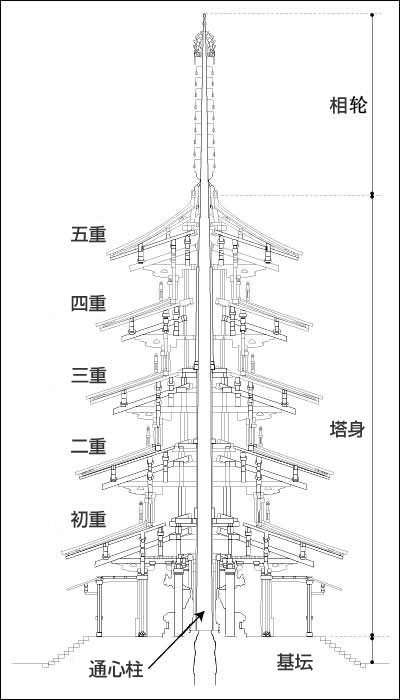 所謂通心柱,是縱貫塔身的粗大木柱,日本的五重塔或是三重塔都有通心柱,但在中國(guó)和韓國(guó)現(xiàn)存的木塔中卻很少見(jiàn)。有人認(rèn)為通心柱是日本木結(jié)構(gòu)佛塔的特點(diǎn)。。