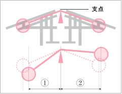 有人也許會(huì)擔(dān)心,重疊的各個(gè)建筑體如果僅是緩緩地?fù)u晃則不要緊,但如果是急劇搖晃,整個(gè)建筑是否就有傾斜而倒塌的危險(xiǎn)。曾經(jīng)有一位專門(mén)修建神社、宮殿建筑的木匠在大地震發(fā)生時(shí)偶然望見(jiàn)五重塔的各層建筑體以相互交錯(cuò)的方向(即下層向左,上層向右,再上層又是向左)在傾斜、搖晃,整個(gè)五重塔就像是在扭蛇舞(見(jiàn)圖1)。大小不同的各重構(gòu)筑體以所謂的「彌次郎兵衛(wèi)平衡原理」(即左右重心平衡,見(jiàn)圖2)所產(chǎn)生的復(fù)原作用而相互錯(cuò)向搖動(dòng),這就是五重塔不倒的原因之四。