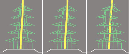 五重塔的建造手法也被應(yīng)用于今天的現(xiàn)代建筑。實(shí)際上,高聳入云的現(xiàn)代化大樓,使用的均是像五重塔那樣的以搖抗震的「柔性結(jié)構(gòu)」,而非石建筑之類的以堅(jiān)抗震的「剛性結(jié)構(gòu)」。如果把后者比作是堅(jiān)實(shí)的橡樹(shù)的話,那么,前者就好比是柔韌的柳樹(shù)。建筑設(shè)計(jì)中的柔性要素,例如被埋在建筑底座下的巨大積層膠,柱、梁、壁等部位的嵌入裝置(D[**]NP[**]),還有樓頂上的水槽(以水的晃動(dòng)來(lái)抵消地震引起的搖動(dòng)),等等,均發(fā)揮著柔性結(jié)構(gòu)的功能作用。