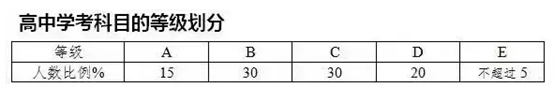成績呈現(xiàn):高中學(xué)考成績采用等級(jí)制,設(shè)[**]、B、C、D、E5個(gè)等級(jí),E為不合格。以卷面得分為依據(jù),[**]、B、C等按實(shí)考人數(shù)15%、30%、30%最接近的累計(jì)比例劃定,E等比例不超過5%。