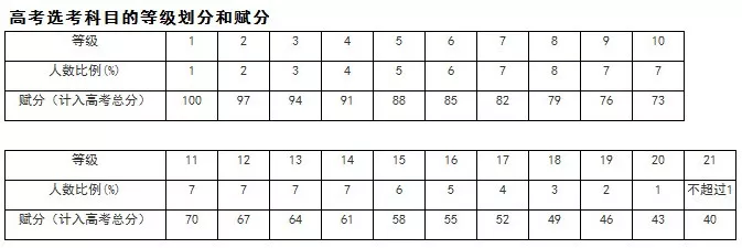 成績呈現(xiàn):考生各科成績按等級(jí)賦分,起點(diǎn)賦分40分,滿分100分,共分21個(gè)等級(jí),每個(gè)等級(jí)分差為3分。